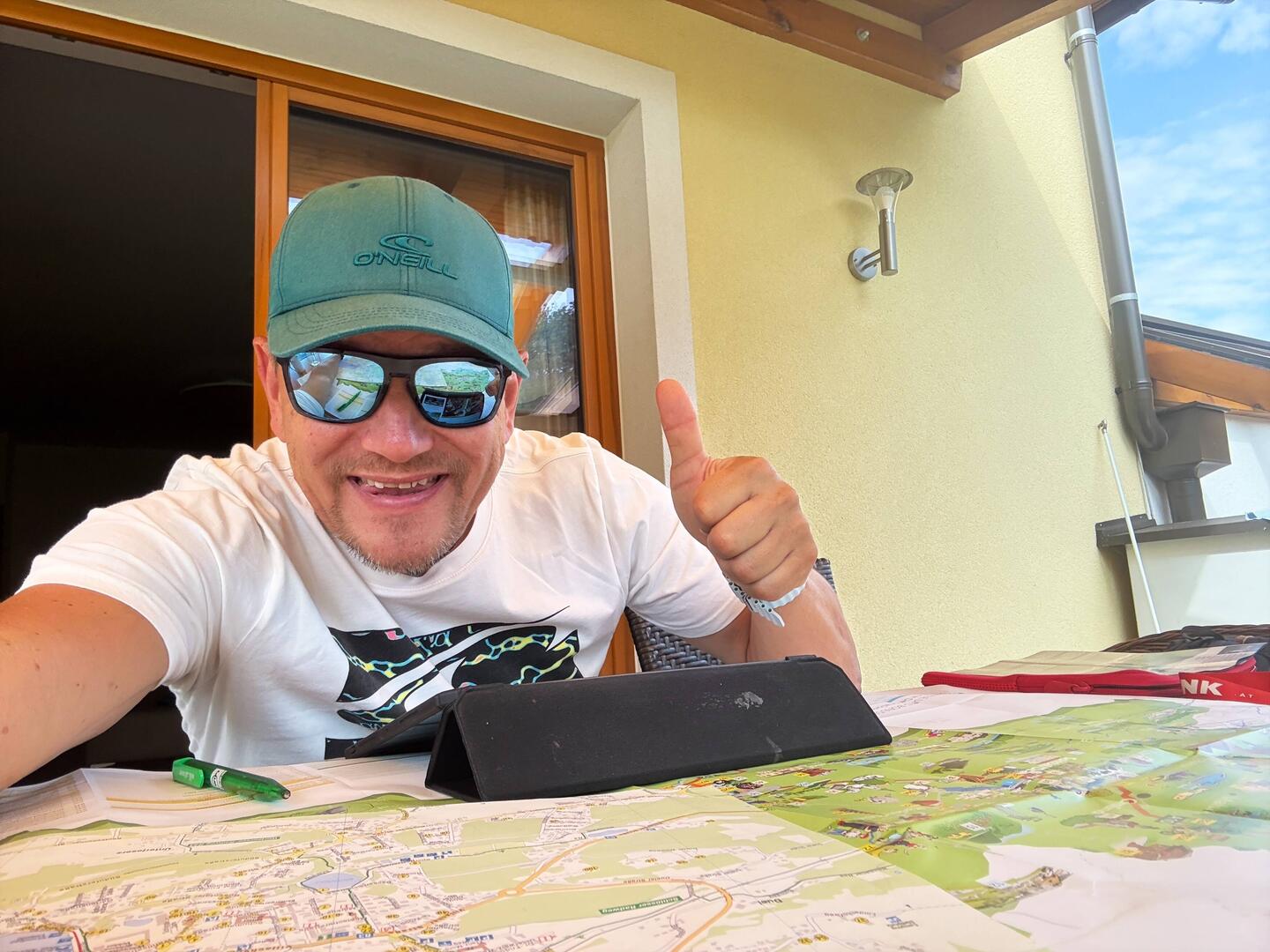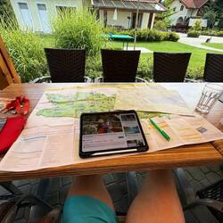 Ich selbst nutzte die Gelegenheit, einmal **Bier beiseite zu stellen** und den **Familiengeneralstab zu eröffnen**. Mit **Landkarten, iPad und einem Stapel Prospekte** bewaffnet, begann ich, eine „Strategie“ für die kommenden Urlaubstage zu entwickeln. Während andere ins Wasser sprangen oder Gläser leerten, brütete ich über Sehenswürdigkeiten, Wanderwegen und Schifffahrtsplänen – quasi der Generalstabsoffizier am Küchentisch.