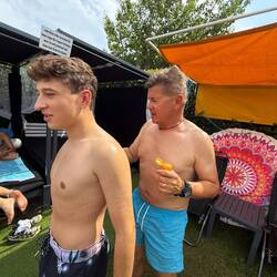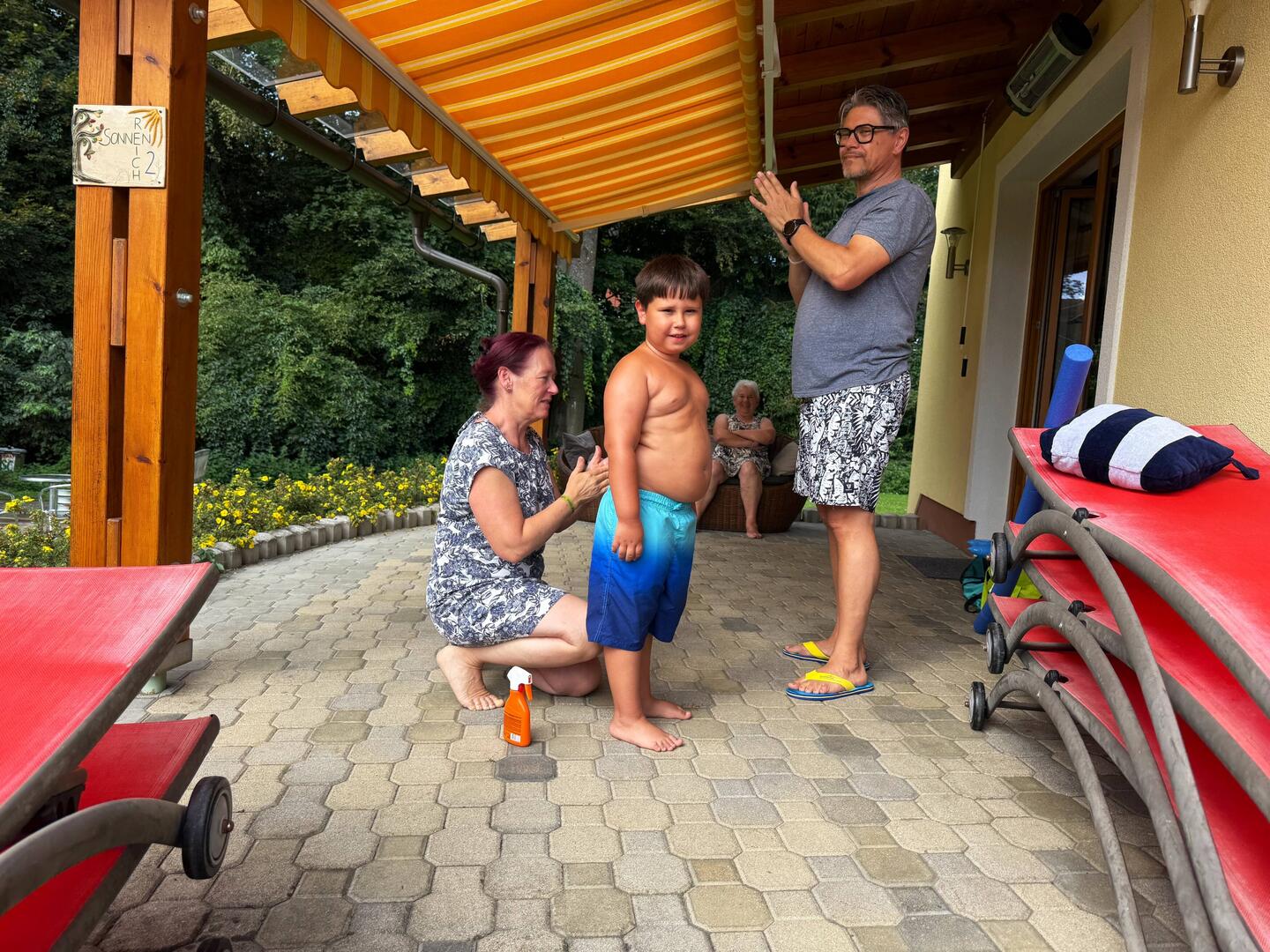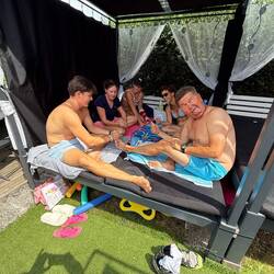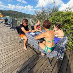 Gestärkt und voller Energie ging es dann zum **hauseigenen Badeplatz**. Dort zeigte sich sofort das herrliche Spektrum der Familienurlaubs-Typen:👙