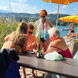 Lachen am Frühstückstisch, Kreischen auf der Luftcouch, Karten wedeln am Badeplatz, Campari-Gläser im Sonnenuntergang, Motorengeheul auf der Kartbahn, und natürlich der legendäre Auftritt vom „Udo vom Wörthersee“.