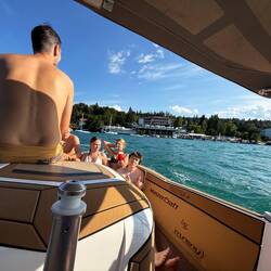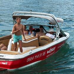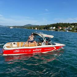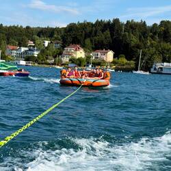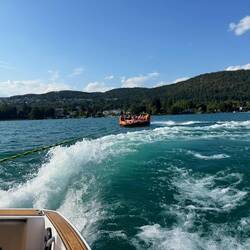 Kaum organisiert, schon startklar. Und dann hieß es: Luftcouch-Wasserfahren – natürlich nicht gemütlich im Schippermodus, sondern gleich Vollgas mit gefühlten 400 PS quer über den Wörthersee. Das Wasser spritzte, die Luftcouch hüpfte, und die Passagiere kreischten in einer Tonlage, die auch Fledermäuse verstanden hätten.
