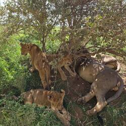 Weiter ging es mit vielen Elefanten, die an diesem Tag besonders zahlreich unterwegs waren. Riesige Familien mit Müttern und Kindern, aber auch einzelne Bullen. Außerdem sahen wir eine große Löwenfamilie mit etwa 13 Jungtieren und fünf Müttern. Leider keine männlichen Löwen, da diese sich eher im Gebüsch aufhalten.