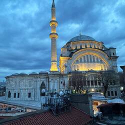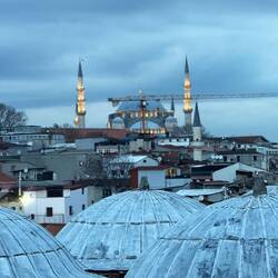 Nach einem kurzen Gang durch die Hintergasse des Basars steigen wir eine Treppe hoch zu einer Seite und zwar schöne, gefälschte Designer Taschen angeboten werden, auf der anderen Seite aber auf eine unbefestigte kleine Terrasse treten können, von der wir exakt zu blauen Stunde einen wunderbaren Blick auf eine Moschee und Dächer haben, die Kulisse des Skyfall Films waren. Von dort aus ist James Bond (Daniel Craig) mit dem Motorrad über die Dächer Istanbuls gerast.