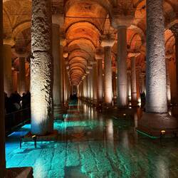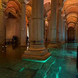 Die Gruppentour (zu Fuß) beginnt um 09.15 mit einem Marsch durch Istanbuls Altstadt zum Hippodrom. In eisigem Wind lauschen wir unserer Reiseführerin Aysun, die lustig und resolut die Gruppe steuert. Vom Hippodrom geht es in die Blaue Moschee. Als Nächstes besuchen wir die Zisterne, ein riesiger Trinkwasserspeicher mit vielen Säulen, der auch bereits Kulisse mehrerer Filme war, u.a. James Bond. Eine sehr beeindruckende Location. Nach einer kurzen Kaffeepause geht es auch schon weiter.