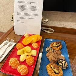 Im Hotel sind wir anschließend erst gegen circa 23:00 Uhr. Dank unserer Reiseleitung finden wir noch ein Entschuldigungsschreiben des Hotels wegen der nächtlichen Störung gestern mit etwas Gebäck und Früchten auf dem Zimmer.