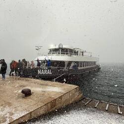 Als es losgeht, kommen schon die ersten feinen Schneeflocken, die sich rasch zu einem ausgewachsenen Schneeschauer vermehren. Am Anfang der Fahrt sehen wir noch etwas vom Wasser und von der europäischen Istanbul-Seite. Nach kurzer Zeit jedoch ist der Schneeschauer schon so stark, dass wir draußen nur noch eine weiße Wand haben und auch die großen Brücken über uns gerade mal als Schatten erahnen können. Das, was uns unterwegs erzählt wird, können wir teils nur noch erahnen. Nach etwas mehr als 1 Stunde machen wir einen kurzen Stop auf der asiatischen Seite. Der Stop ist allerdings zunächst sehr abrupt, da das Schiff (vielleicht aufgrund der schlechten Sicht) mit ziemlichen Karacho gegen den Steg donnert. Zum Glück haben wir noch gesessen…