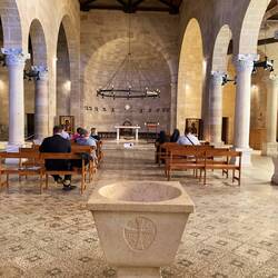 There is a limestone rock and a mosaic of loaves and fishes. I am not sure of the dishware under there. From wiki: Under the altar is a block of limestone found during excavation, that is venerated as the stone on which the miraculous meal was laid.