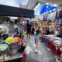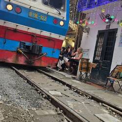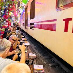Nach dem Einchecken im Hotel holt Lili, unsere Reiseleiterin uns ab . Es geht zur Strasse , wo ein Zug durch eine ganz enge Gasse fährt.