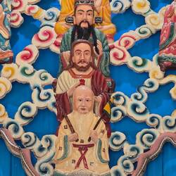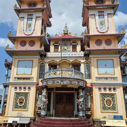 Unser neuer Guide mit Chauffeur holt uns ab in Richtung Mekong.Unterwegs sehen wir noch einen Tempel, der 3 Religionen miteinander vermischt.