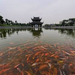 In der Nähe von Tam Coc besuchten wir die Bai Dinh Pagode, die mit 539 ha grösste buddhistische Tempelanlage Vietnams. Wir waren fast die einzigen westlichen Touristen und eine Gruppe Männer wollten alle mit Yannick Fotos machen 😅.