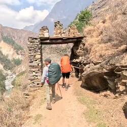 Nach einer entspannten Nacht in unseren "Luxussuite" machten wir uns auf den Weg nach Jagat. Am tosenden Fluss entlang wanderten wir durch die Dörfer der "Gurung", ein buddhistischer Stamm, der hier heimisch ist. Von den grossen Bergen waren heute nur bereits die Spitzen zu sehen, links und rechts von uns stiegen mächtige Felswände empor, die das Deng Valley bilden. Der Weg ging zwar auf und ab, viele Höhenmeter legten wir jedoch nicht zurück - "nepali flat", meint Mim. Als wir nach ca. 6 Stunden Laufzeit Jagat erreichten, kamen uns 4 Männer entgegen, die einen Kranken auf einer Pritsche trugen. Unser Guide efklärte uns, dass sie bis nach Macha Kohla (also dort, wo wir an diesem Morgen gestartet waren) gehen müssen, damit ein Jeep ihn ins Krankenhaus fahren kann. Die geplante Strasse, die hier in Bau ist, wird wohl erst in ein paar Jahren befahrbar sein.