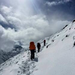 Als die Sonne gegen 16 Uhr hinter den Wolken verschwand und wir uns es gerade in unserem Container unter den stinkenden Decken gemütlich machten, verkündete Mim, er gehe mit den anderen Guides auf eine Rettungsaktion. Unterhalb des Passes steckten zwei nepalesische Touristen seit einem Tag in einem Bivak fest. Die Höhenkrankeit habe sie erwischt und deshalb warteten sie im Bivak auf Hilfe. Da der Helikopter aber aufgrund des schlechten Wetters nicht fliegen konnte, mussten sie in der Kälte ausharren. Sie verbrannten all ihre Kleidung und ihre Rucksäcke aus Verzweiflung. Fünf Stunden später trafen die Guides mit dem halb erfrorenen Paar ein, die Frau wimmerte und der Mann konnte nicht mehr laufen. Mim meinte, wenn er und die anderen Guides sie nicht gerettet hätten, hätten sie die Nacht bestimmt nicht überlebt.