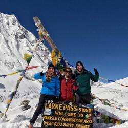Am nächsten Morgen war nicht viel Zeit, um gemütlich Tee zu trinken. Um 5.30 Uhr zogen wir unsere Gräppini an und machten uns auf den Weg zum Pass. Der Aufstieg war für mich besonders zu Beginn schwierig, das Atmen fiel mir schwer und die Füsse spürte ich fast den ganzen Morgen nicht mehr. Als es wieder etwas flacher wurde, gewöhrte ich mich an die Höhe und es ging wieder schneller voran. Die Wanderung durch das endlos erscheindende Plateau zog sich ziemlich in die Länge aber die fantastische Aussicht auf die 7- und 8000er um uns herum, allen voran der mächtige Manaslu, machte diese wieder wett. Nach 4 Stunden war auch der letzte kleine Aufstieg geschafft und endlich erreichten wir den Larke La Pass auf 5100 Metern! 🤗 Wuhuu!