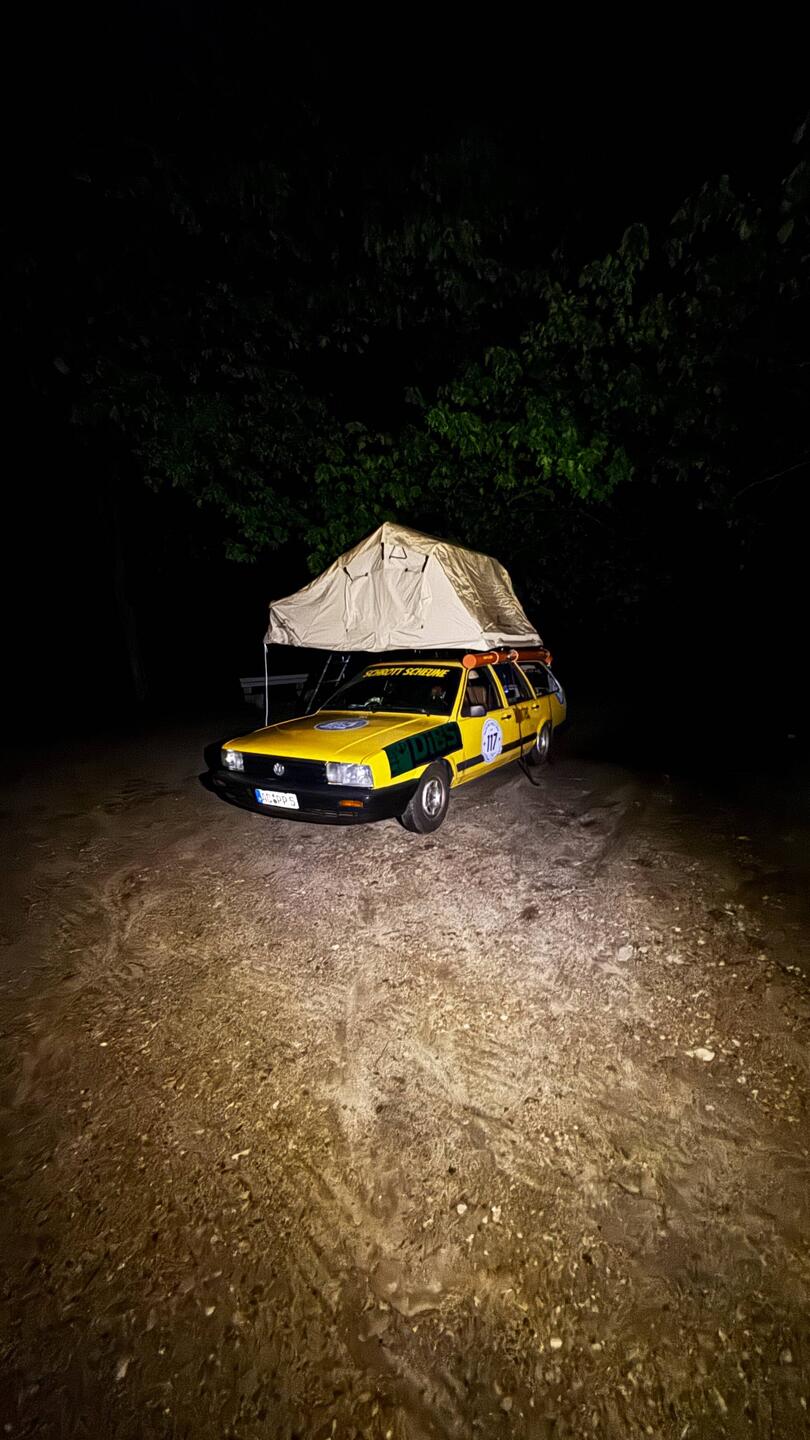 Die erste Erprobung unseres Camps. Zum Glück ist es trocken und der Aufbau auch im Dunkeln kein Problem. (Lennard hat zugeguckt)