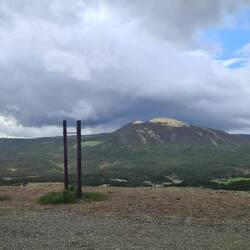 Hoher Berg im Hintergrund. Und ein Posti mit Problemen. (Vielleicht haben miese Elektrik Probleme)