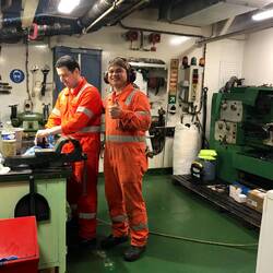 Neben den 3 Maschinisten arbeitet ein 9-Zylinder Caterpillar-Motor bei konstant 500/min. Die Geschwindigkeit des Schiffs regelt der verstellbare Propeller.