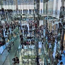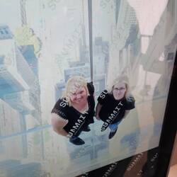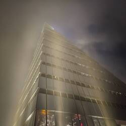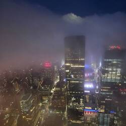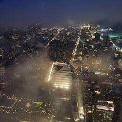 Als es endlich soweit ist und wir das 100. Stockwerk erreicht haben, müssen wir leider feststellen, dass die Spitze des Hochhauses tief im Nebel versunken ist.