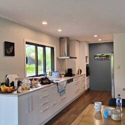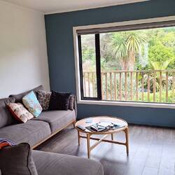 Unser Haus in drr 119 Ocean View Road ist ein Traum. Groß, mit drei Schlafzimmern und großem, offenen Küchen- und Wohnbereich. Ist in orivatem Besitz. Wir haben eine riesige Terrasse, an die sich ein traumhafter Gartenbereich anschließt. Einen Tui- Vogel haben wir offenbar auch im Garten, denn die typischen Vogellaute erkenne sogar ich inzwischen sofort.