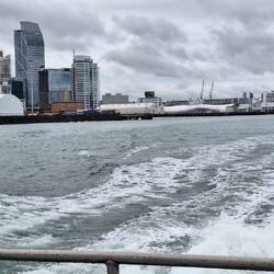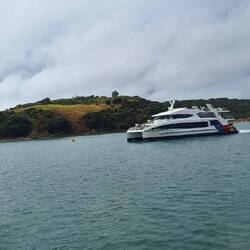 Nach zwei Stunden Warten sind die beiden auch endlich am Fährhafen angekommen und wir haben unser Gepäck dann zum Pier gebracht, wo auch kurz darauf unsere Fähre nach Waiheke Island abgelegt hat. Man hatte trotz bewölktem Wetter (wird ab morgen wieder sonniger) vom Wasser aus einen guten Blick auf die Skyline von Auckland.