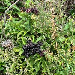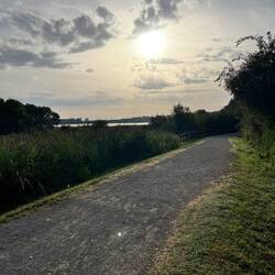 Started out at 6:00am, walking with the an unusual full blue moon. Arrived at my destination at 1 pm. Quickly found a bed at a hostel with 10 bunks in the room. No prior reservation. The walk was so beautiful. I saw dairy cows and pasture with beautiful backroads lined with trees. I ate black raspberries and dark purple elderberries. So yum!! I met more wonderful people, had great, sometimes moving conversations and now after a hamburger and beer, I am soaking my feet in a cool river. My feet are pretty happy and that translates to a happy me. Photos of my steps, dairy pastures, my fantastic breakfast, elderberry bush, the Alberque (shelter) for tonight, bunk room, video of skinny dairy cat and Zubiri direction sign with bell ringing dairy cow nearby.Læs mere
