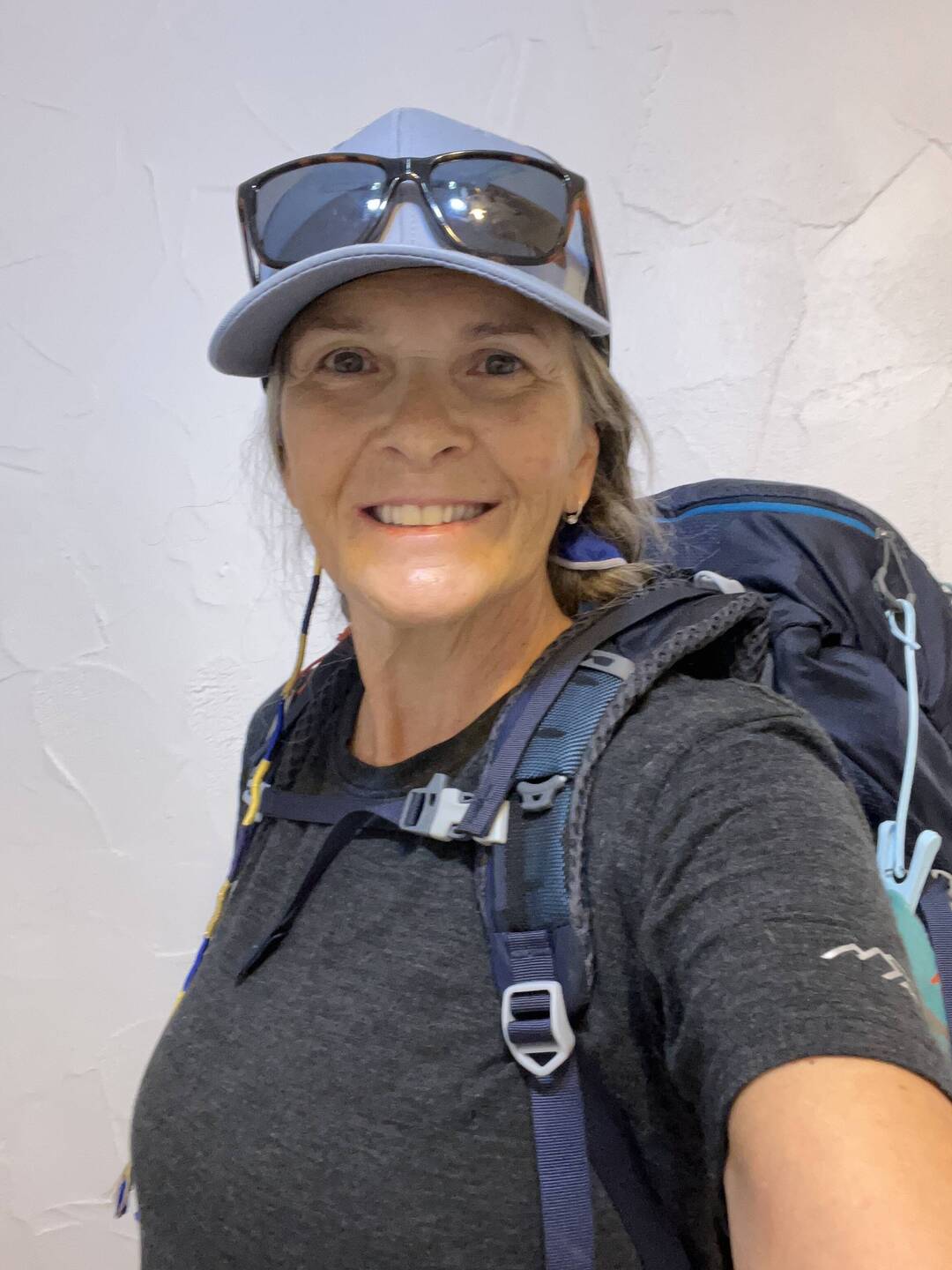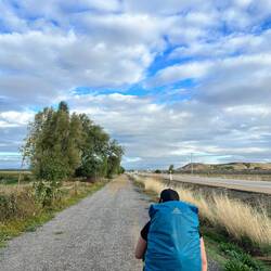 A little rain spattered today, but hardly enough to don the rain poncho. Didn’t get sunny and hot until a mile before stopping point. My legs are getting used to the miles and my feet barely yell at me anymore. With the exception of a tiny blister on my little piggy.