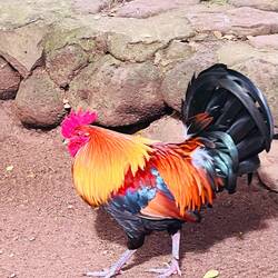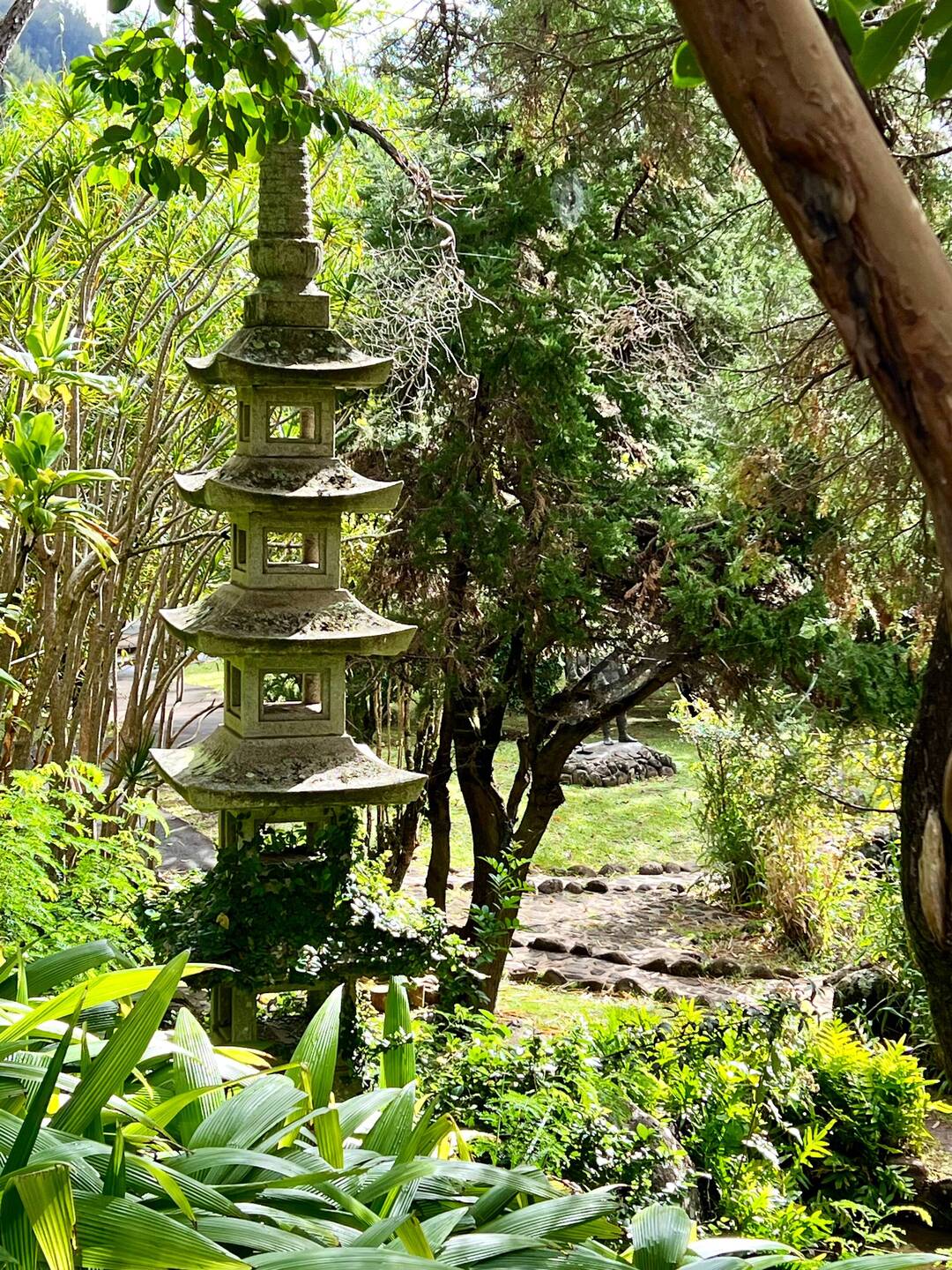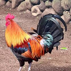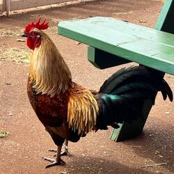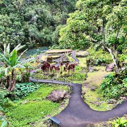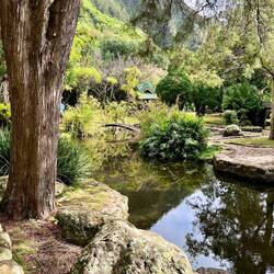 A Japanese style garden with photogenic rooster, koi ponds and lovely walking paths lined with beautiful trees and plants.