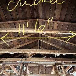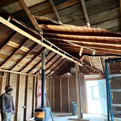 Brice installs a cross beam the entire length of the house to get ready to vault the ceiling.