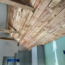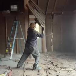 With the header support beam in place and standing on two solid upright support beams the ceiling cross boards are ready to be removed. About 90% as open as it will eventually be. Just a few cuts leftRead more