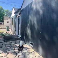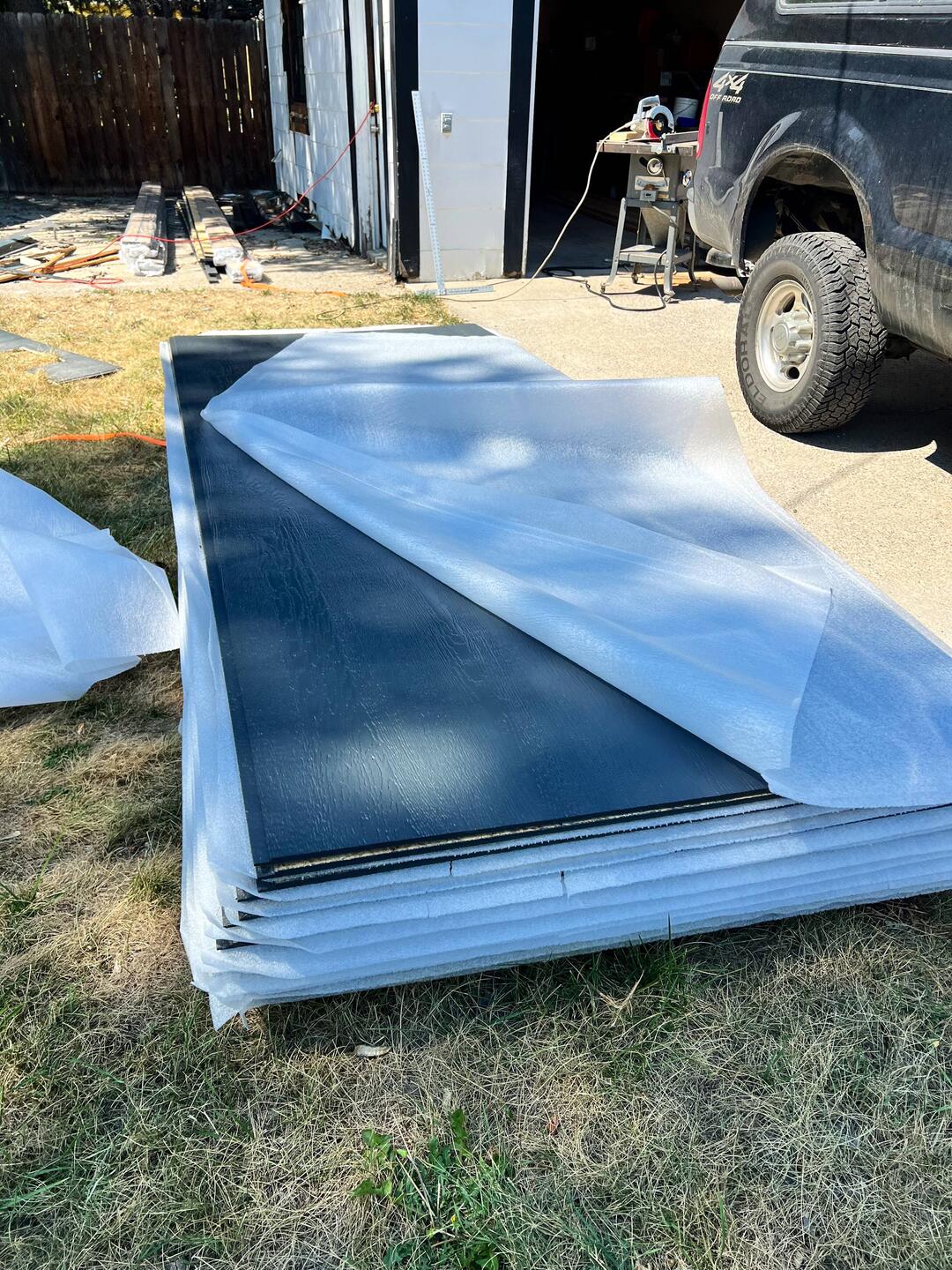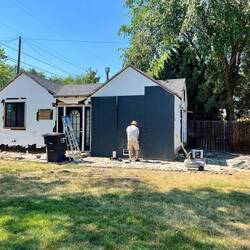 The siding is board and baton style. It will require a vertical installation. Brice started taking off boards to get ready for new surface. The new siding comes pre- painted in a dark grey. So excitedRead more