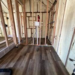 The vinyl tile plank flooring. This is the type that is rubbery and comes in tiles that are 4” x 3ft. It was are installed throughout the whole house. It has a wood look and has grays and browns.Read more