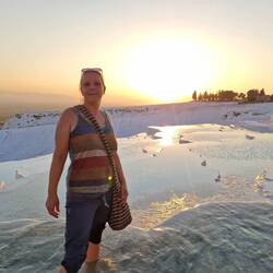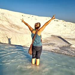 Pamukkale ist eine Stadt im Westen der Türkei. Sie ist für das mineralhaltige Thermalwasser bekannt, das über die weißen Sinterterrassen eines nahe gelegenen Hügels herabfließt.