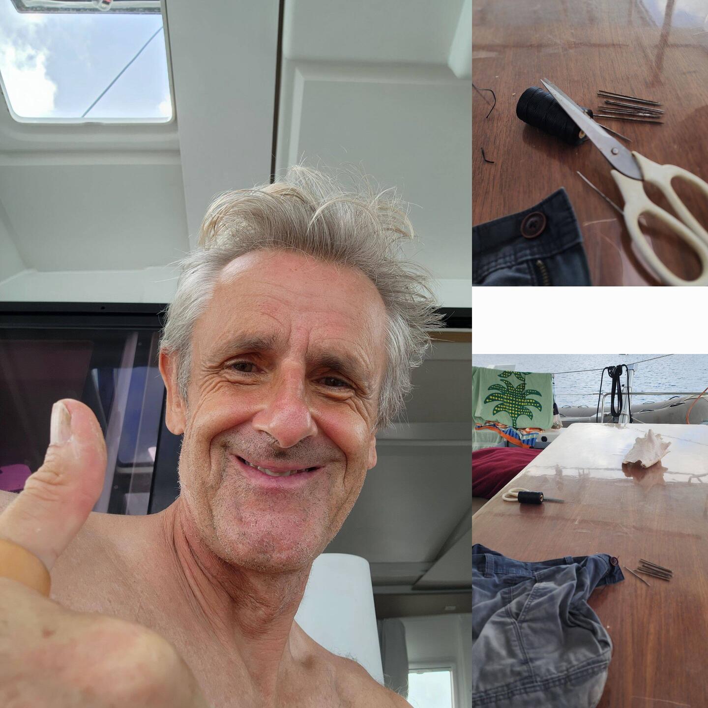Happy captain after stitching his shorts. Mahana adventures :)))