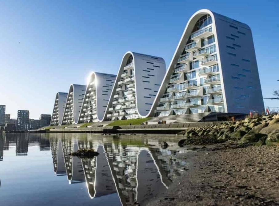 "Inmitten des Vejle Fjord erhebt sich das Fjordenhus mit seinen vier überschneidenden Zylindern 28 Meter in die Höhe. Die aus speziell glasierten Ziegelsteinen errichtete Fassade wurde mitもっと詳しく
