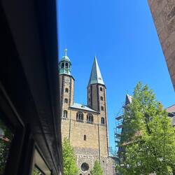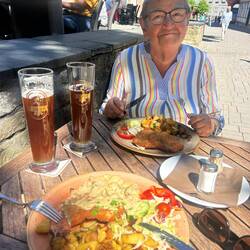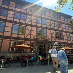 Ankommet til Goslar i solskinsvejr. Gik ned til byen og gik rundt i de gamle gader. Der kørte et tog rundt i byen, så sådan en tur tog vi. Derefter sad vi udenfor og spiste wienerschnitzel. ILeggi altro