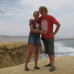 Bij terugkomst in de haven hadden we nog een halfuurtje vrijaf om vervolgens weer de bus in te gaan naar het Reserva Nacional de Paracas.....niet veel meer dan een eorme grote zandbak waar je doorheen kunt rijden....af en toe een mooi uitzicht....een klein baaitje om te zwemmen met koek en zopie....en rode stranden. Ook hier hebben we wat mooie plaatjes geschoten.