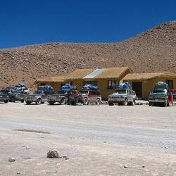 We bezochten de vulkaan Ollague op 5800 m en Saltlake Chiguana.In Sanjuan stopten alle jeeps voor een pauze bij de supermarkt en werd de weg vervolgd naar Villa Candelaria...de plaats waar we gingen pitten....met alle crew's van alle jeeps in een zout hotel.