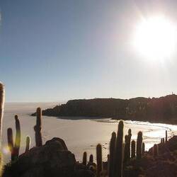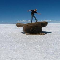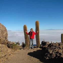 We hebben genoten van de opkomst van de zon en zijn doorgereden naar island Incahuasi (wel vreemd op een zoutvlakte...) waar we aanmeerden met de jeep in de zouthaven. Het was een eiland vol met poeptussen....nooit zoveel bij elkaar gezien!! We hebben het eiland rondgestruind en poeptussen van wel 12 meter gezien. Daarna had Anna aan de zouthaven een lekker ontbijt voor ons gemaakt en zaten we aan een zouttafel in de zon te pummelen...en de struisvogel te voeren. Struisvogel? Hoe komt die nou hier? Door een toerist achtergelaten! Tuurlijk, je gaat met een struisvogel op reis en....???????