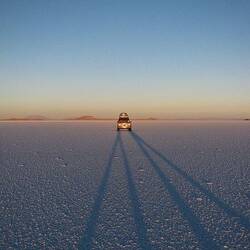 We zaten al voor zessen in de jeep...in het donker.....en het was koud! Om de hoek van het hotel begon de zoutvlakte.....tenminste, na het regenseizoen was het eerste gedeeld een plas water van ongeveer tien centimeter. Edgar vertelde dat het nog wel twee weken zou duren voor het helemaal droog zout zou zijn...als het niet meer regende!! Wij hebben overigens mazzel gehad de afgelopen vier dagen...geen regen en over het algemeen strak blauwe luchten.