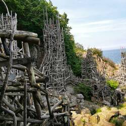 Kurze, aber sehr knackige Wanderung zum Kunstwerk Nimis (Überfluss), einem Labyrinth aus verschiedenen, überwiegend aus Treibholz gebauten Türmen am Fuße der Steilküste des Kullabergs.