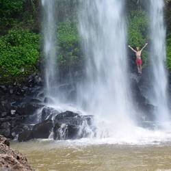 An einem anderen Tag, gingen wir zu einem weiteren Wasserfall, unter dem man auch schwimmen konnte. Unweit vom Eingang wurde uns empfohlen, einen 3km Pfad zu laufen und den Salto Arrechea zu besuchen. Wenn man den Pfad geht, merkt man irgendwann, dass man gar nicht nochmal Eintritt hätte zahlen müssen, da man von der Straße aus einen Zugang hat aber eine Spende an die Pflege der Natur ist ja immer eine gute Investition. Wir schwitzten uns also wieder ordentlich einen ab, bestaunten neugierig was da alles im dichten Dickicht kreuchte und fleuchte und sprangen in die wunderbare Erfrischung. Ein geschätzt 20m hoher Wasserfall prallte auf pechschwarze Steine, die von frischem Grün umgeben waren. Davor bildete sich ein natürlicher Pool und alles war von feinen Wasserpartikeln umgeben. Ein wenig sah dieser Ort unwirklich aus, war aber einfach wieder nur ein Wunder der Natur, an dem auch sehr wenig los war. Wir genossen diesen sehr natürlichen Ort, badeten und liefen wieder zurück.