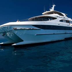 We than headed back to deck two and our seats. We were given a safety briefing. After the safety briefing, we were asked if anyone wanted to scuba dive. Bob and I both raised our hands. We were given paperwork to fill out which included health history. We were told that anyone over 65 who was on medication would not be able to scuba without a medical dive certification. Consequently, Bob was not able to dive.