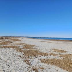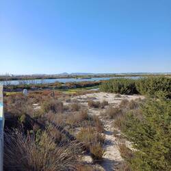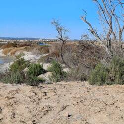 Der Weg zum ausgesuchten Parkplatz führt uns an den Salinen entlang. Es gibt sehr viele, relativ große Becken in denen Wasser mit unterschiedlichem Salzgehalt steht, je röter desto salziger. Der Betreiber achtet offensichtlich auf seine Anlage, alles ist aufgeräumt, die Wege und Parkplätze gut befestigt. An den Stränden liegt feiner Sand und Unmengen von angeschwemmtem Seegras. Wie wir schon im Ozeaneum und jetzt von den vielen Infotafeln gelernt haben ist das Positoniagras überlebenswichtig für die Meeresbewohner und schützt als abgestorbene Masse an den Stränden vor Erosion, außerdem düngt es die Vegetation an den Stränden die dann wieder den Sand festigt. Am ganzen Mittelmeer entlang gibt es verschiedene Projekte zum Schutz oder Wiederansiedlung dieser Wasserpflanze.