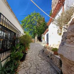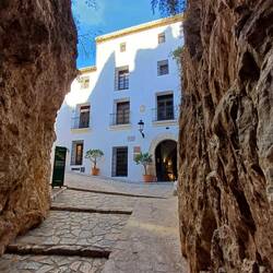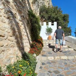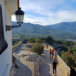 Der untere Teil wird El Arrabal genannt, er ist noch außerhalb der Befestigung. Schon hier gibt es kleine Läden und Bars. Über eine schön angelegte Rampe geht man unterhalb des Berges entlang und kann dabei einen Blick durch Palmen auf das Meer erhaschen, über eine gewundene Treppe erreicht man einen Tunnel der in das ursprüngliche Dorf unterhalb der Festung führt. Auch hier finden sich viele Läden die die typischen Mitbringsel für Touristen führen, aber alles ist so pittoresk und schön aufbereitet daß wir uns angenehm unterhalten fühlen und ich natürlich auch etwas zum mitnehmen finde. Die Aussicht von der oberen Terrasse auf die Burg weiter oben und das Tal mit dem Stausee und den Bergen rundum ist fantastisch, wir können uns kaum sattsehen. Von hier oben aus ist allerdings auch das ganze Ausmaß der Austrocknung des Sees erkennbar, wie schon bei Riano macht uns diese Auswirkung des Klimawandels und der gedankenlose Umgang mit der Recource Wasser betroffen.