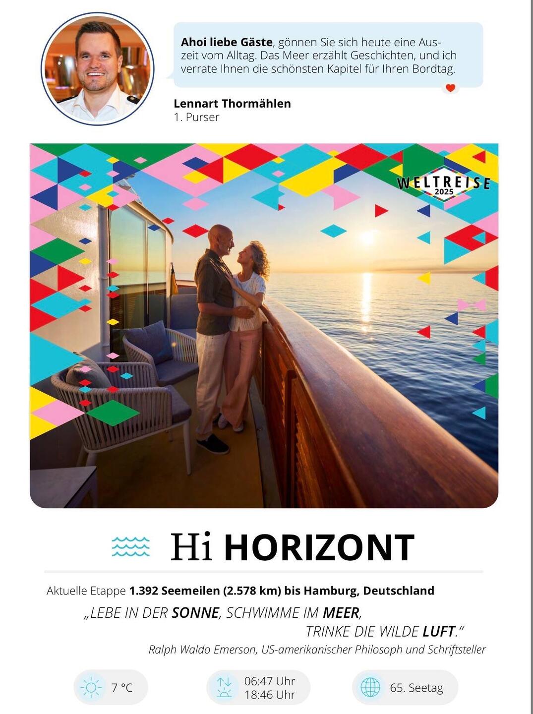 Wir streifen ohne festes Programm über das Schiff, bleiben hier hängen, schauen dort noch einmal hinaus. Dinge, die selbstverständlich geworden sind, bekommen plötzlich Gewicht.