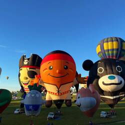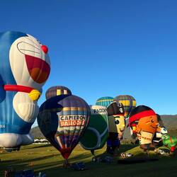 Chelsea caught the sunrise balloon flights, seated on a hill above the flight field at Luye Highlands. The blue animated cat Doraemon is a major draw and extremely popular in Taiwan, drawing many oohs and aahs from the crowd as he expanded into the sky. Other popular balloons included a small Shiba Inu, and a pair of giant green inflatable pants, advertising an online betting platform (though gambling is illegal in Taiwan…).