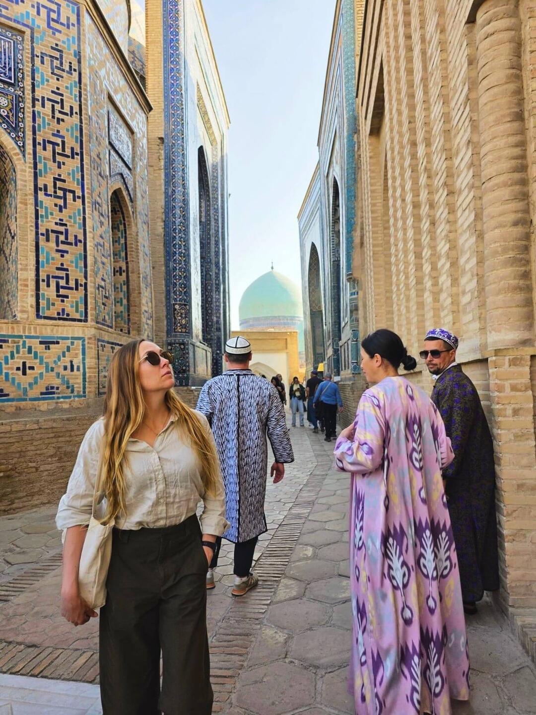 What does a ‘living museum’ entail? Khiva’s ancient city has been preserved to such a degree that it is both beautiful and sterile. There is no spark to the city, it is a film set—literally. On our last day, Chelsea accidentally wandered from the bazaar straight onto the set of ‘Aladdin’, and made pals with some soldiers, locals from Khiva making cash as extras. Captain Farhar, the Uzbek policeman who jumped in as photographer, was deeply amused that she shares a name with a football club. On learning that she is South African, he also commented generously, ‘Your English is very good.’