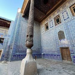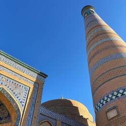 Dan was still recovering from the end of his illness when we arrived, but Khiva turned out to be maybe the ideal place to recoup: it's tiny, and the main activity is just wandering around the 1km square area of the ancient city. It is possible to stay inside the city walls and some locals do live here, but mostly the buildings are given over to small museums, artisan workshops, and cafés. The streets are lined with stalls selling traditional goods, mostly gorgeous textiles. The turquoise-tiled domes and minarets rise over the flat roof mud buildings and no structures inside or outside the ancient city are permitted to exceed four floors—the minaret’s majesty is respected and preserved in what is sometimes called a 'living museum '.