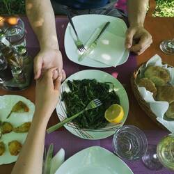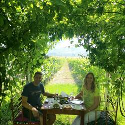 Gutes Abendessen bei einem netten, älteren Ehepaar 😀 herrliches Musaka und 'Bamje me mish' (Fleisch mit Okrafrucht) zu leckerem Tomatensalat und selbstgemachtem Weißwein.