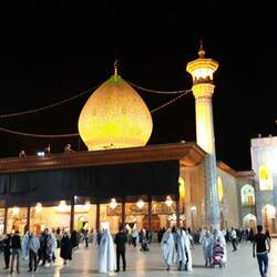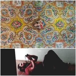 A Chiraz nous nous rendons à la mosquée Nizamulmolk, où la combinaison de colonnes torsadées, de faïences bleues et roses, de vitraux et de riches tapis crée une ambiance douce et chaude. Quand Pamela, la strip-teaseuse, arrive en petite tenue... Non zut, ça c'est une autre histoire. Pardon, on reprend. Au pavillon Qavam, Khalid s'allonge sur le sol pour photographier les plafonds peints et au mausolée de Hafez, des perruches choisissent des poèmes pour les visiteurs. La nuit tombée, nous nous rendons au mausolée de Chah Geragh. En tant que touristes on nous dit qu'on ne peut pas se promener seuls : on doit se faire escorter par Zeynab, qui arbore une écharpe "International affairs" sur la poitrine (nous? Des "international affairs"? Quelle promotion😋). On discute un peu, elle est intriguée par le fait qu'on puisse être un couple chrétien/musulman et se demande si c'est compliqué! Elle prend le temps de nous faire voir pas mal de choses et nous recommande des textes qu'elle aime.