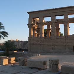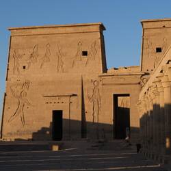 Le jour suivant nous visitons le très documenté Musée Nubien où on tombe sur une représentation du dieu Toth* sous sa forme babouinesque, arborant un drôle de zizi tout flasque. Puis nous nous rendons à Philae visiter le temple d'Isis. Il faut prendre un bateau pour y aller et Khalid doit négocier quinze minutes pour qu'on paie le prix qui est pourtant ECRIT sur une pancarte. De quoi devenir zinzin... 🙃 mais nous sommes les derniers touristes de la journée et on a la chance de visiter le site tranquilles, aux dernières lueurs.