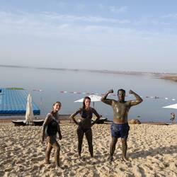 Descente de Madaba vers la Mer Morte, en passant par Machéronte où se serait situé le palais de Hérode. Le promontoire est inaccessible, il ne devait pas avoir souvent de la visite... Séance de flottaison rigolote dans la Mer Morte. Impossible de couler, même debout dans l'eau ! Test des vertus de la boue pour la peau : ça pique, ca sent bizarre, mais pas vu de miracle.Read more